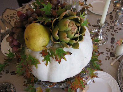 An artichoke, pear and a bunch of grapes all "plopped" on top of the pumpkin. Maybe for Thursday I'll change out the fauxs for the real McCoy, maybe not. I also tucked in some oak leaves to soften the edges.